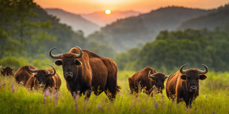 A bison stands prominently, its thick fur glistening in the fading light. The gentle gaze of the animal tells a story of strength and tranquility amidst the vast open fields.