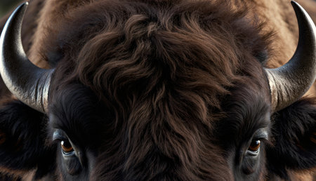 Aggressive wild bison with horns ready to charge creating a dangerous situation for onlookers. Concept Wildlife encounter, Bison behavior, Animal safety, Potential danger, Wildlife photography