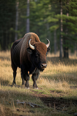 A large bison is the focal point of this image, standing in a field. The scene captures a natural environment with trees in the background, under overcast lighting. The composition is suitable for various commercial uses, including illustrations and editorial content, and it evokes a sense of wildlife.