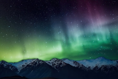 Majestic mountains under the vibrant Northern Lights with a starry sky background showcasing vivid colors