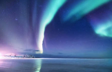 Aurora borealis in the night northern sky. Ionization of air particles in the upper atmosphere.