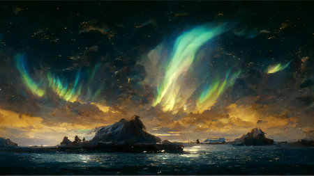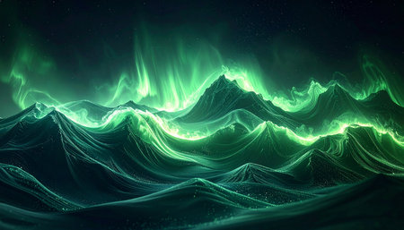 An illustration captures the aurora borealis illuminating the night sky with vibrant green colors. The image features a mountainous backdrop with the glow reflected on a body of water. This captivating scene could be used for various projects, including editorial features or commercial designs, evoking wonder and natural beauty.