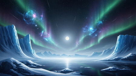 An AI generated illustration of a stunning nightscape of the Arctic with Northern Lights