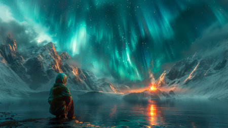 The sky is filled with auroras, and the mountains in the background are covered in snow. The scene is serene and peaceful, with the glowing lights of the auroras creating a sense of wonder and awe