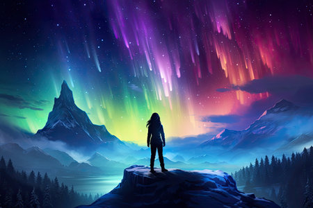woman silhouette stand on cliff look at the colorful sky with aurora borealis