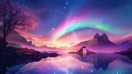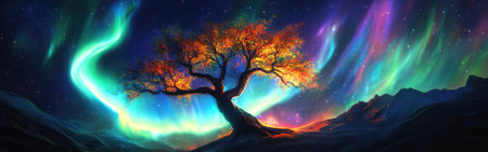 This captivating landscape showcases a mystical tree illuminated by colorful auroras. Its branches merge seamlessly with the vibrant hues of the northern lights, set against a starlit night sky.