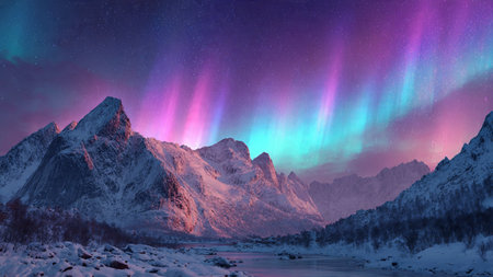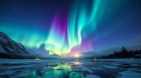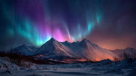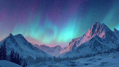 Magical winter panorama featuring glowing auroras above icy peaks.