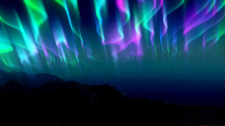 The abstract background of the multi-colored northern lights and mountains in the north, a bright iridescent realistic light in the sky.