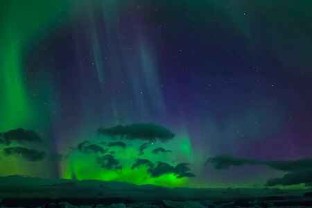 Beautiful panoramic Aurora Borealis or better known as Northern Lights for background view in Iceland, Jokulsarlon during winter Dreamy atmosphere. Happy New Year