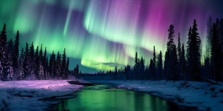 Stunning aurora borealis display over a snowy river and a pine forest. A captivating winter scene.