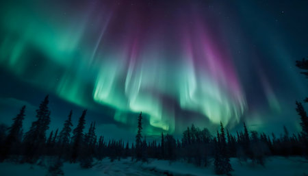Arctic winter scenery illuminated by radiant aurora borealis glow.