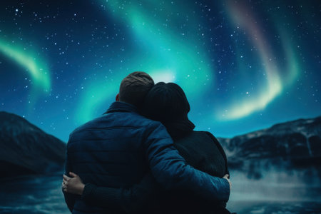 A couple enjoys a romantic moment while watching the vibrant aurora borealis above a tranquil lake at night.