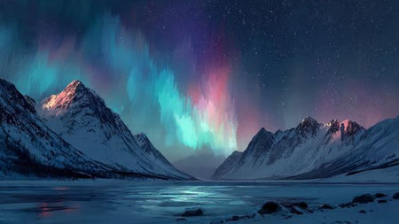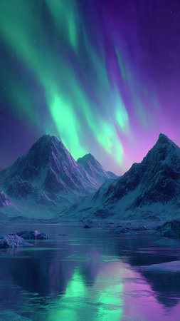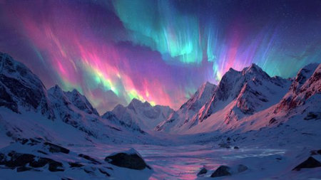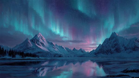 Dreamy winter landscape with glowing northern lights and frozen peaks.