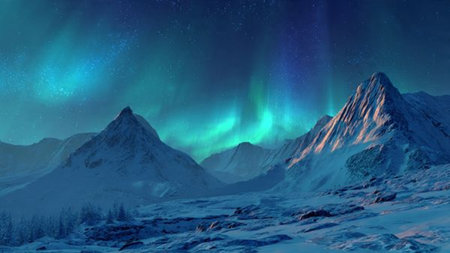 Arctic-style landscape with snow-covered mountains and glowing auroras.
