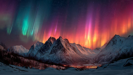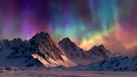 Arctic winter panorama featuring snow-covered mountains and radiant auroras.