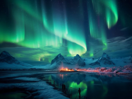 An illustration captures the aurora borealis illuminating the night sky with vibrant green colors. The image features a mountainous backdrop with the glow reflected on a body of water. This captivating scene could be used for various projects, including editorial features or commercial designs, evoking wonder and natural beauty.