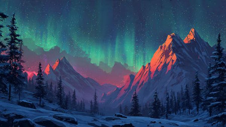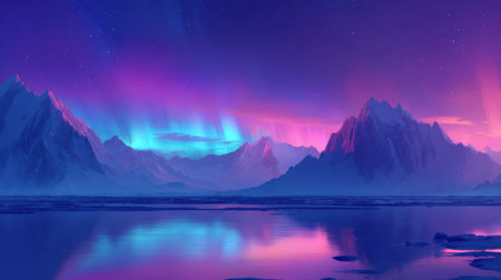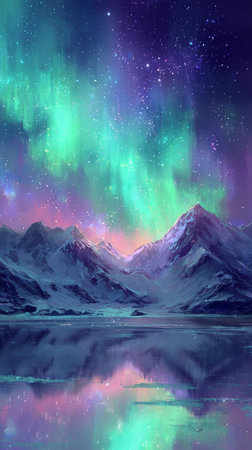 An illustration captures the aurora borealis illuminating the night sky with vibrant green colors. The image features a mountainous backdrop with the glow reflected on a body of water. This captivating scene could be used for various projects, including editorial features or commercial designs, evoking wonder and natural beauty.