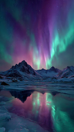 Ethereal Northern lights display over a cold ocean coastline, with vibrant colors reflecting off the frozen sea