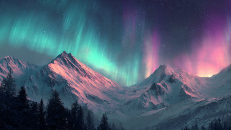 Magical snowy peaks highlighted by vivid aurora lights.