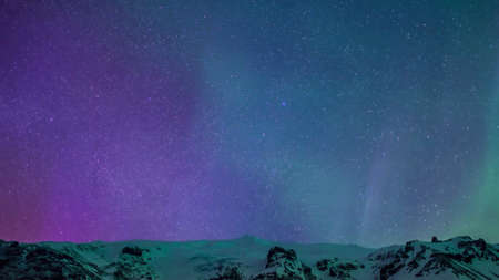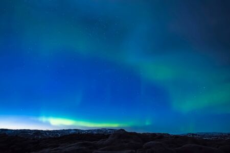 Aurora borealis in the night northern sky. Ionization of air particles in the upper atmosphere.