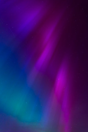 A stunning display of vibrant purple and blue aurora borealis lights streaks across a dark, starry night sky.