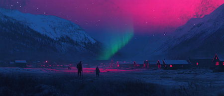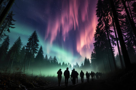 Northern lights illuminating the sky as travelers watch in awe, a perfect winter destination for nature lovers.