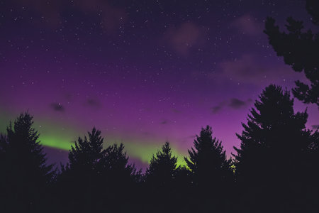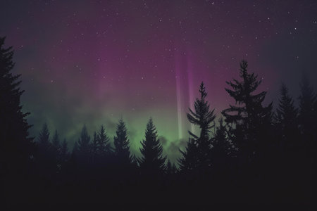 Silhouettes of trees against a mesmerizing backdrop of the northern lights, creating a magical and surreal atmosphere.