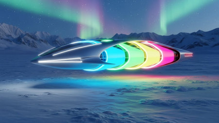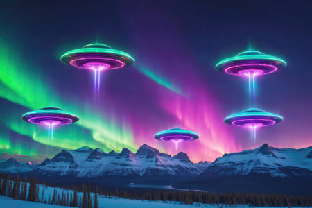 Spectacular Display of Colorful Northern Lights Over Snow-Capped Mountains With UFOs Illuminating the Night Sky