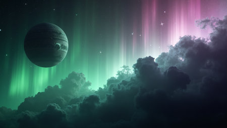 Vibrant green and purple aurora nebula with stars and a ringed planet