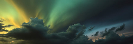 Breathtaking sunset with vibrant yellow and green hues over dark clouds, showcasing natures beauty at dusk