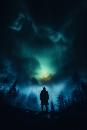 A solitary figure stands atop a rocky outcrop, gazing at the shimmering northern lights illuminating the dark skies above a snow-covered landscape. Chill winds enhance the enchanting atmosphere.