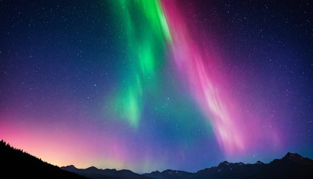 A breathtaking display of the aurora borealis illuminates the night sky with vibrant colors over serene mountains and wilderness.