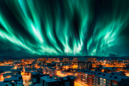 The city is transformed by vibrant aurora lights that dance across the night sky, casting a magical glow over the buildings and streets below