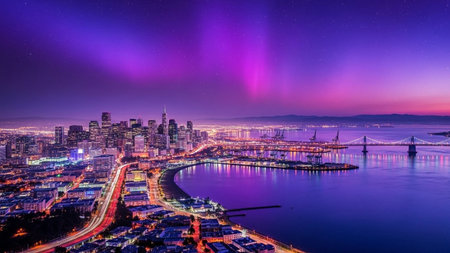 A aerial view of the San Francisco cityscape at twilight, illuminated by a vibrant display of the aurora borealis in the night sky. The city's skyline, bridges, and bay are aglow with artificial lights, contrasting with the ethereal purple and pink hues of the celestial phenomenon above. The water reflects the city's glow, creating a and magical scene that blends urban grandeur with natural wonder.
