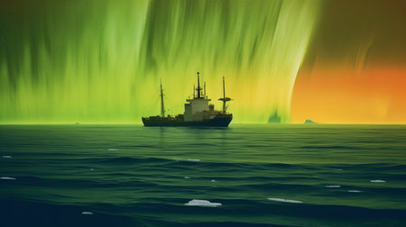 this stunning photo by cihija andrews captures an auroral ship hovering above the ocean, reminiscent of the style of boris kustodiev. the light yellow and green hues create a dreamy atmosphere, while the intricate details of the ship give it a science fiction feel, similar to the work of guido van helten. the image also evokes the detailed illustrations of philip mckay, known for his