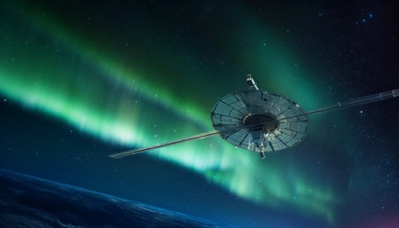 Conceptual, high-angle view of a planet at night, featuring prominent streaks of bright magenta and cyan light rising from city lights on the surface and arcing outward into the dark expanse of space, set beneath a faint green glow resembling an aurora borealis across the upper atmosphere.