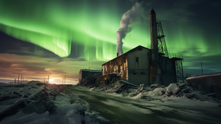 Aurora borealis illuminates the night sky above a rural power line structure in a barren landscape