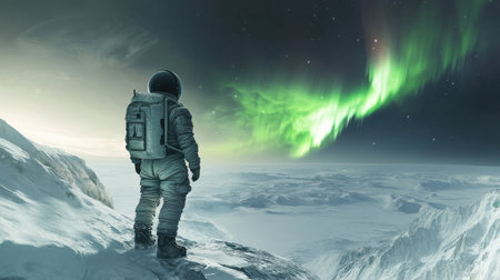 An astronaut stands on a snowy surface, captivated by the radiant auroras in vibrant alien colors illuminating the frozen sky of a distant exoplanet.