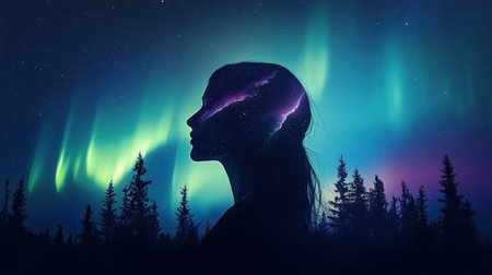 In a tranquil wilderness setting at night, a woman with a serene expression stands silhouetted against a vibrant aurora. The colorful lights dance above, enhancing her ethereal presence.