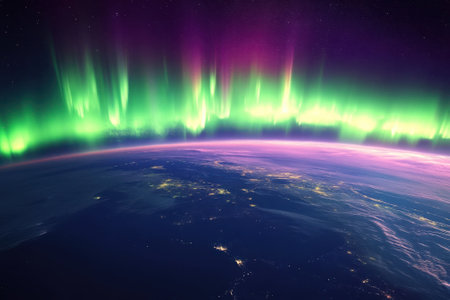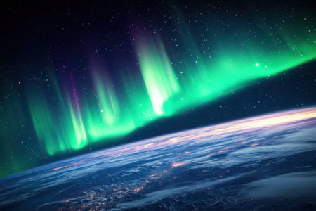 Vivid auroras illuminate the night sky above Earth, showcasing a breathtaking natural light display.