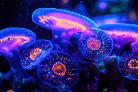Group of rare colored jellyfish close-up, dark background. AI generated. Marine ocean fauna, wildlife. Header banner mockup with copy space.