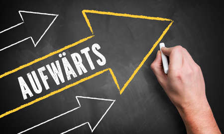 hand drawing several upwards pointing arrows and the word upwards in German