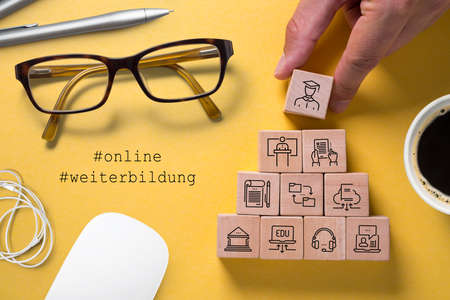 components of digital learning as icons on cubes and the words online and further education in German