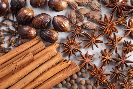 Brown spices on wooden background. Cinnamon sticks, nutmeg, cloves, allspice, star anise.
