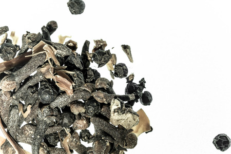 Herbs and seasonings - dried coriander, peppercorn, flax seeds, mustard, clove, cumin, parsley and poppy seeds in a transparent dish isolated on white background.