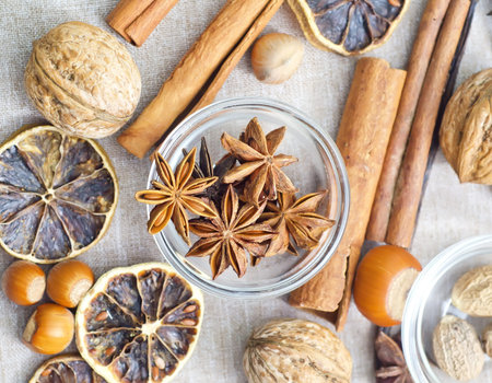 Ingredients: anise star, cinnamon sticks, coffee beans and tangerine. Top view