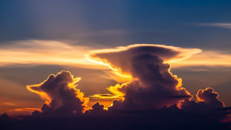 Towering cumulus clouds catch the golden light of sunset, casting dramatic shadows against a deep blue sky with...