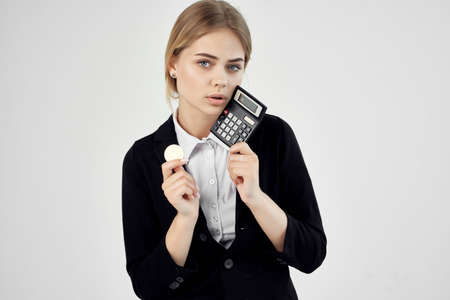 Asset account. Financial crisis 2021. Statement analysis. Business profit. Woman hand holding calculator displaying digital number isolated on black empty space background.