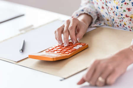 Businesswoman using orange calculator in the office as she sits at her desk, close up view of her hands.