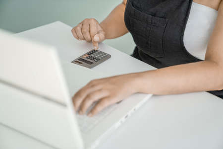 Close up Businesswoman using calculator and laptop for do math finance on wooden desk in office and business working background, tax, accounting, statistics and analytic research concept